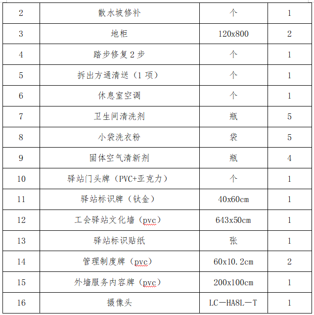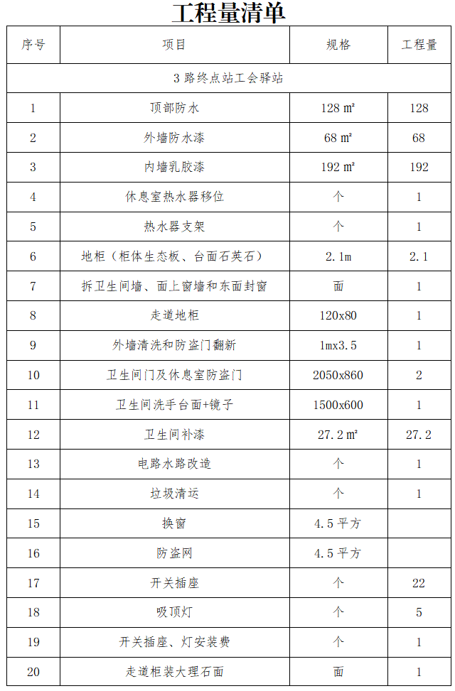 工程內(nèi)容:3路、8路終點(diǎn)站及出租車駕駛員休息驛站,統(tǒng)一規(guī)劃、整合升級(jí),具體內(nèi)容詳見(jiàn)工程量清單(附件)。